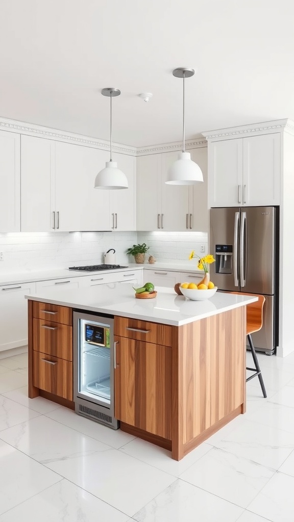 Integrating appliances into your kitchen island can boost functionality and style. The image shows a sleek island featuring rich wood cabinetry and a modern mini-fridge. This setup not only offers extra storage but also keeps beverages close at hand.