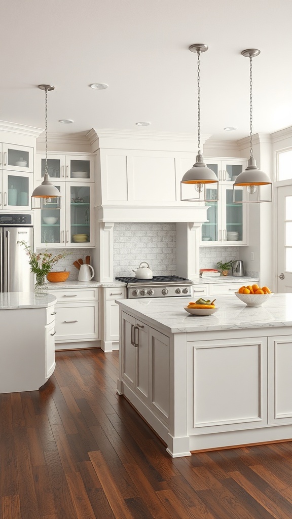 In terms of design, the white cabinetry and warm wood flooring in the image create a welcoming atmosphere. The pendant lights above the islands add a touch of style and ensure the space is well-lit. The overall layout encourages movement and conversation, making it ideal for families and guests.