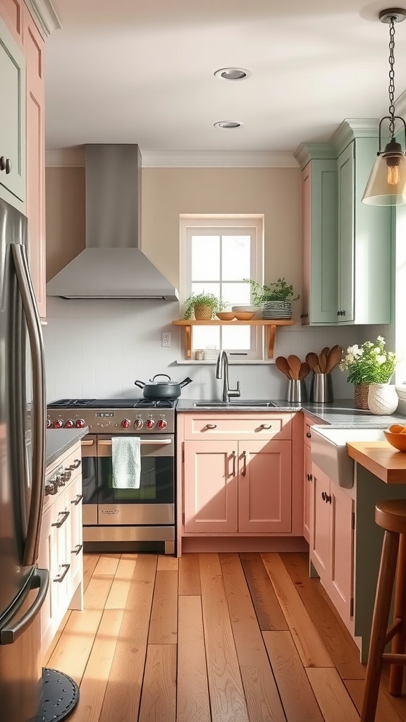 Don’t shy away from mixing colors, too! Two-tone cabinets can really stand out. The pink and green in the image are a fantastic example. It creates a playful, homey atmosphere, perfect for gathering with family and friends.