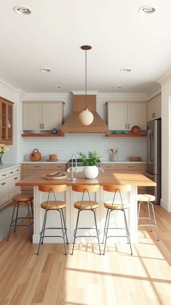 The image showcases a bright and inviting farmhouse kitchen featuring an open concept island. This design creates a spacious feel, allowing movement and interaction among family and friends. The warm wood tones of the island contrast beautifully with the soft cabinetry, adding a cozy touch to the modern aesthetic.