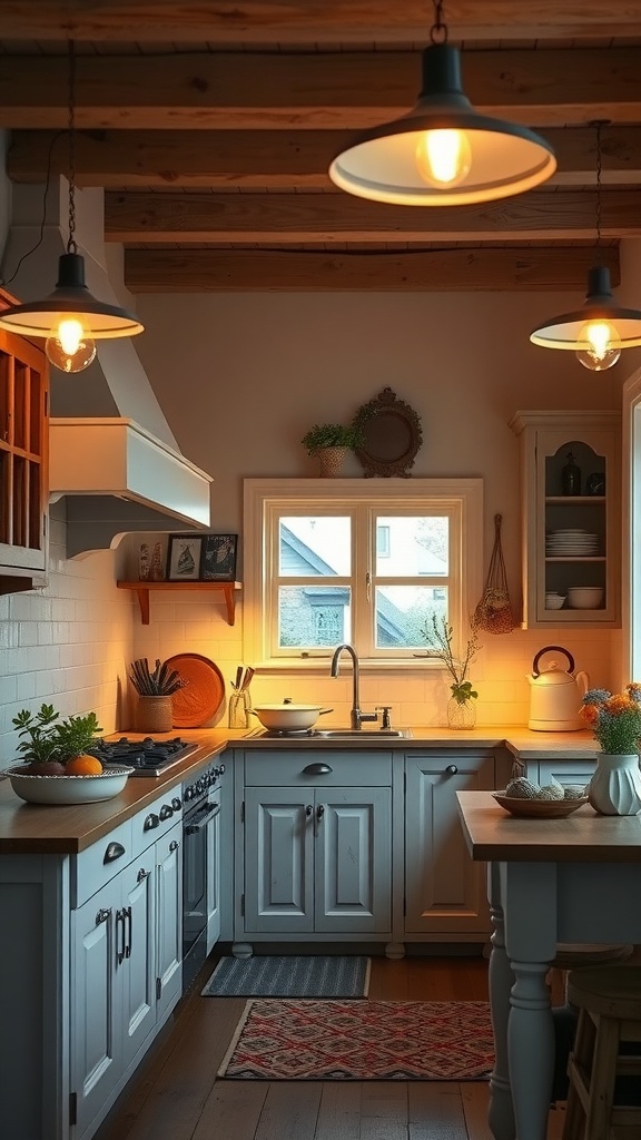 The kitchen captures a cozy, cottage-style vibe, enhanced by charming light fixtures. Three pendant lights hang gracefully from the ceiling, each casting a warm glow that illuminates the space below.