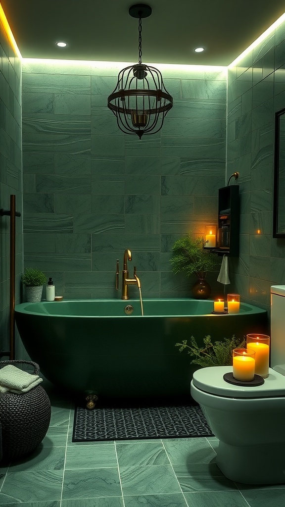 In a bathroom with rich green and black tones, lighting plays a key role in creating a lively atmosphere. The image showcases a well-thought-out lighting setup that complements the dark hues beautifully.