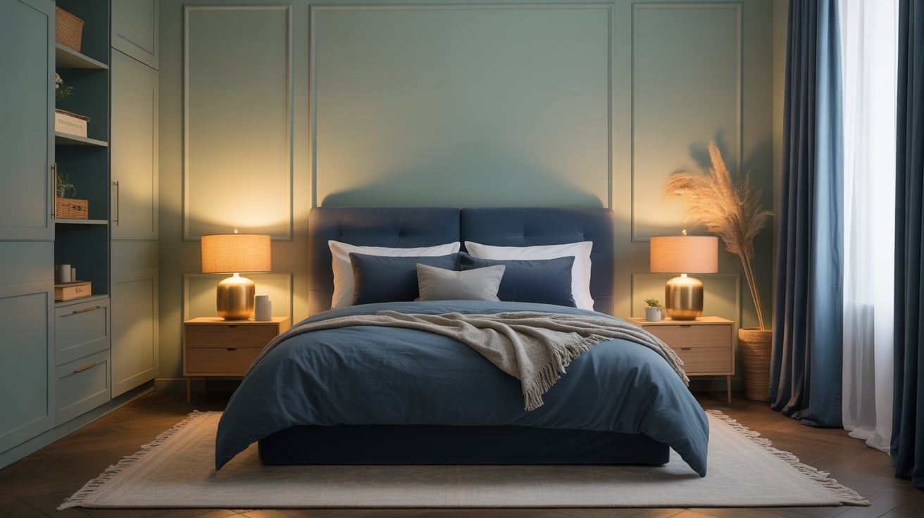 Sage green walls create a soft, calming backdrop while navy blue adds depth and elegance. This combination works well for both small and large bedrooms, keeping the room fresh but not overwhelming.