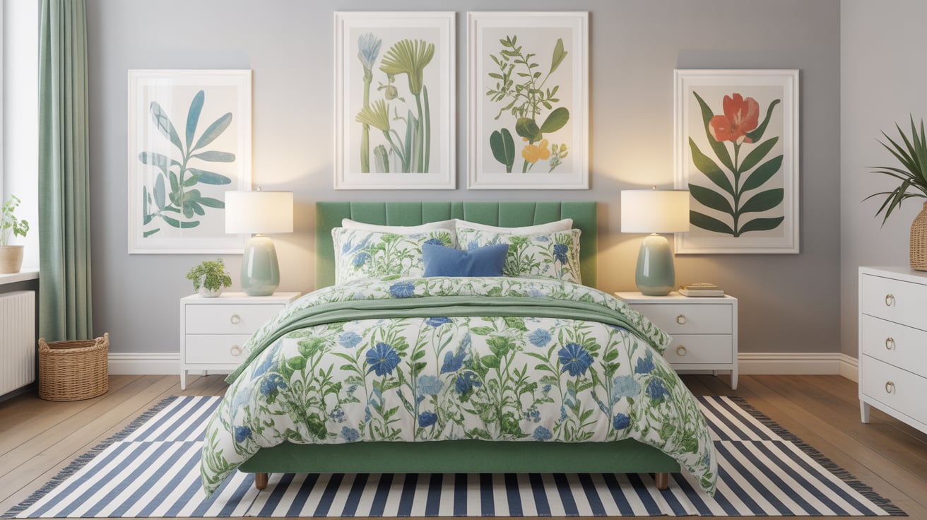 Patterns like stripes, florals, or geometric prints bring fun and character to any bedroom. Mixing blue and green patterns in cushions, rugs, or wallpaper adds visual interest.