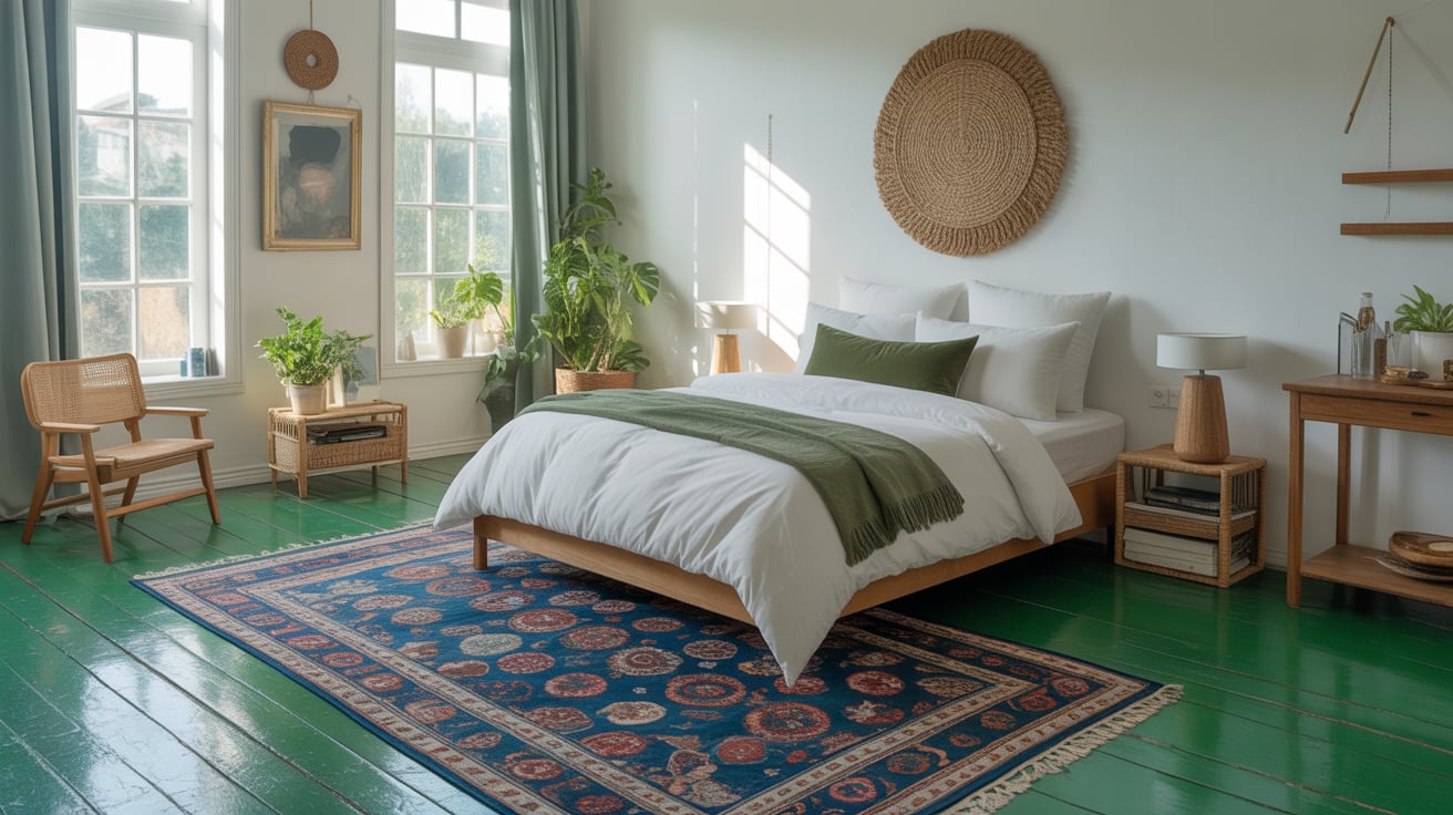 Flooring is an underrated design element. If you have green carpet or a painted floor, layer it with a blue rug for instant charm. The contrast adds personality to your bedroom.