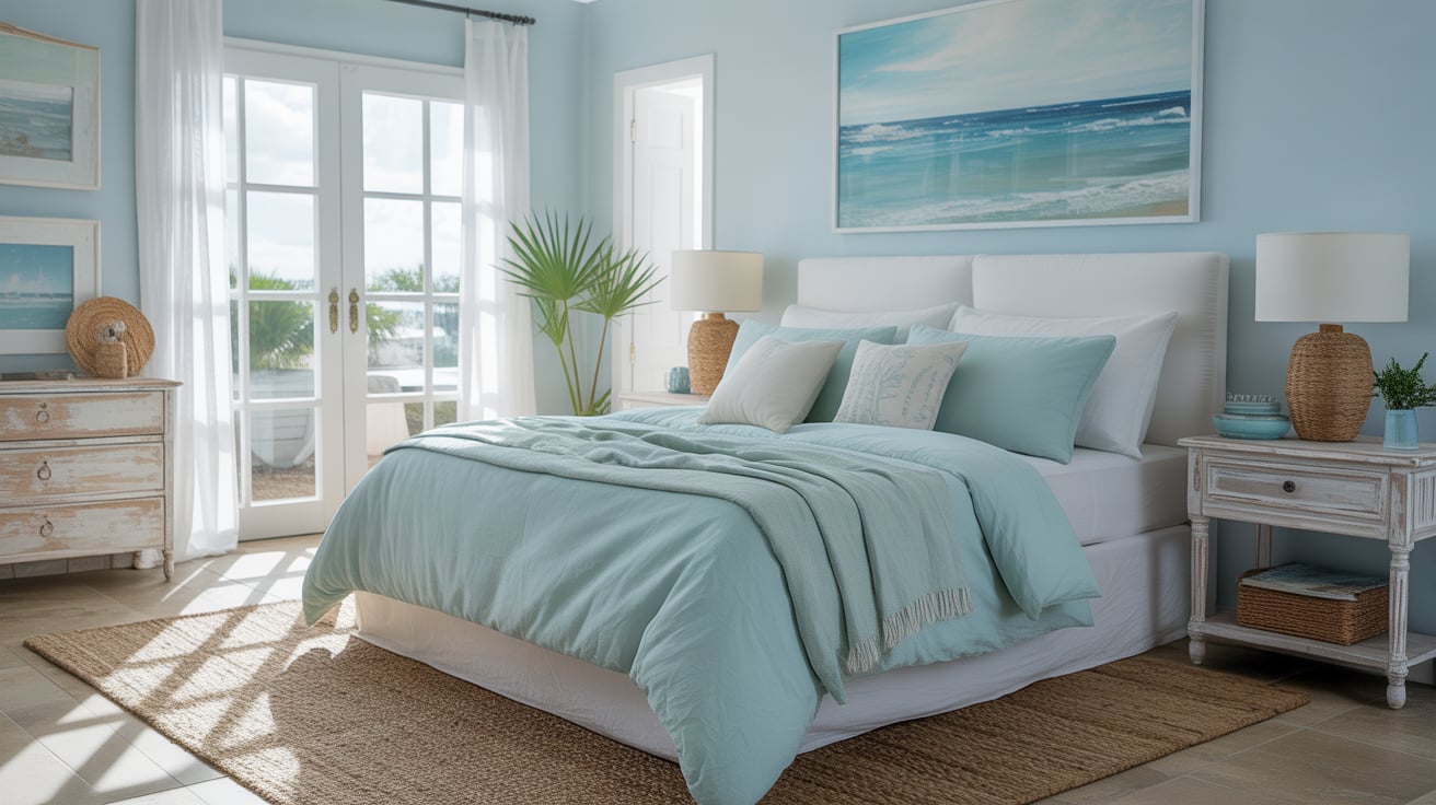 For a light and breezy bedroom, combine aqua blue with seafoam green. This palette brings coastal charm, making your room feel like a calm seaside retreat.