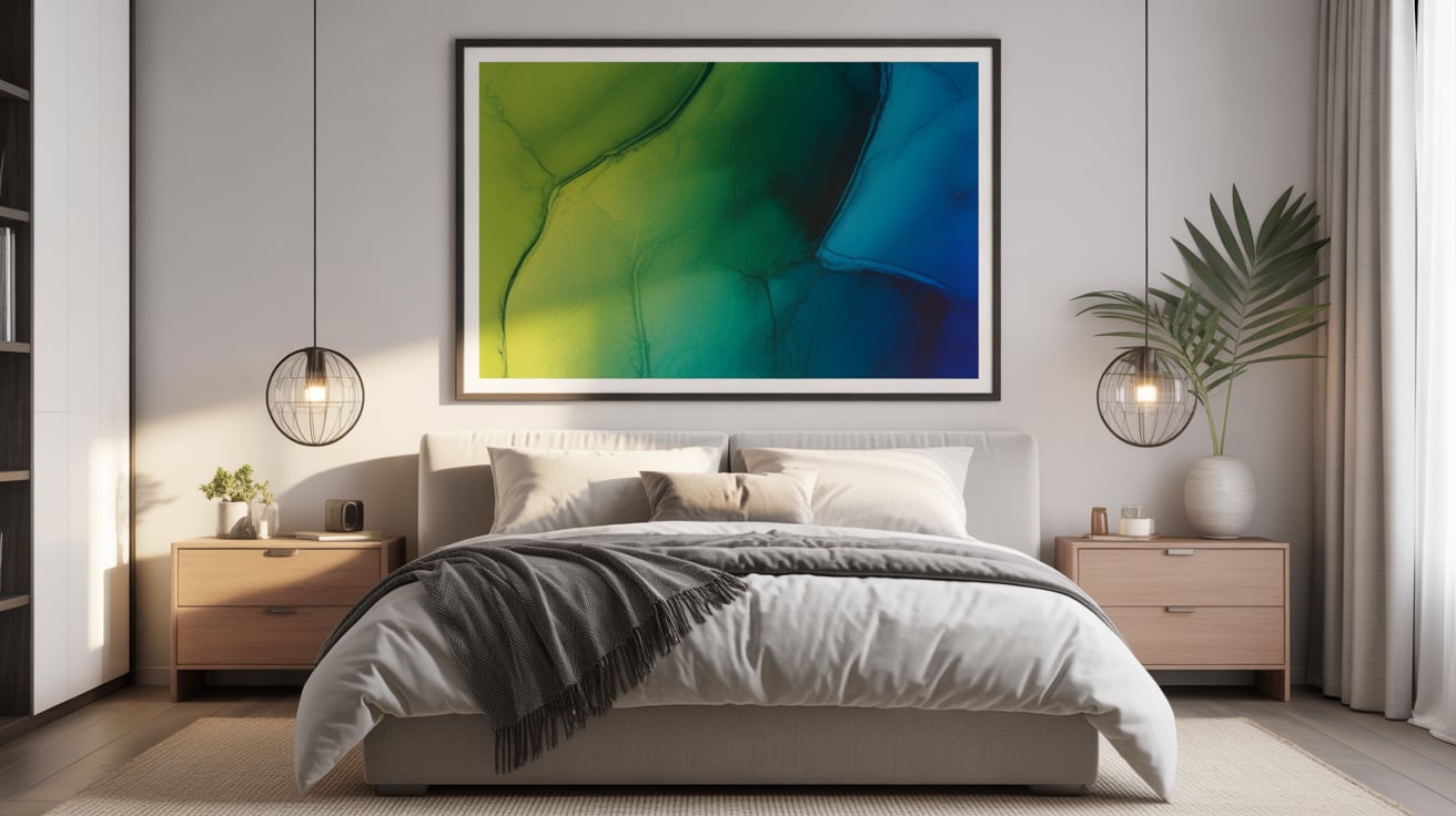 Hang abstract pieces above the bed or mix smaller frames with botanical and coastal themes. This creates visual interest without overpowering the space, giving you flexibility to update easily.