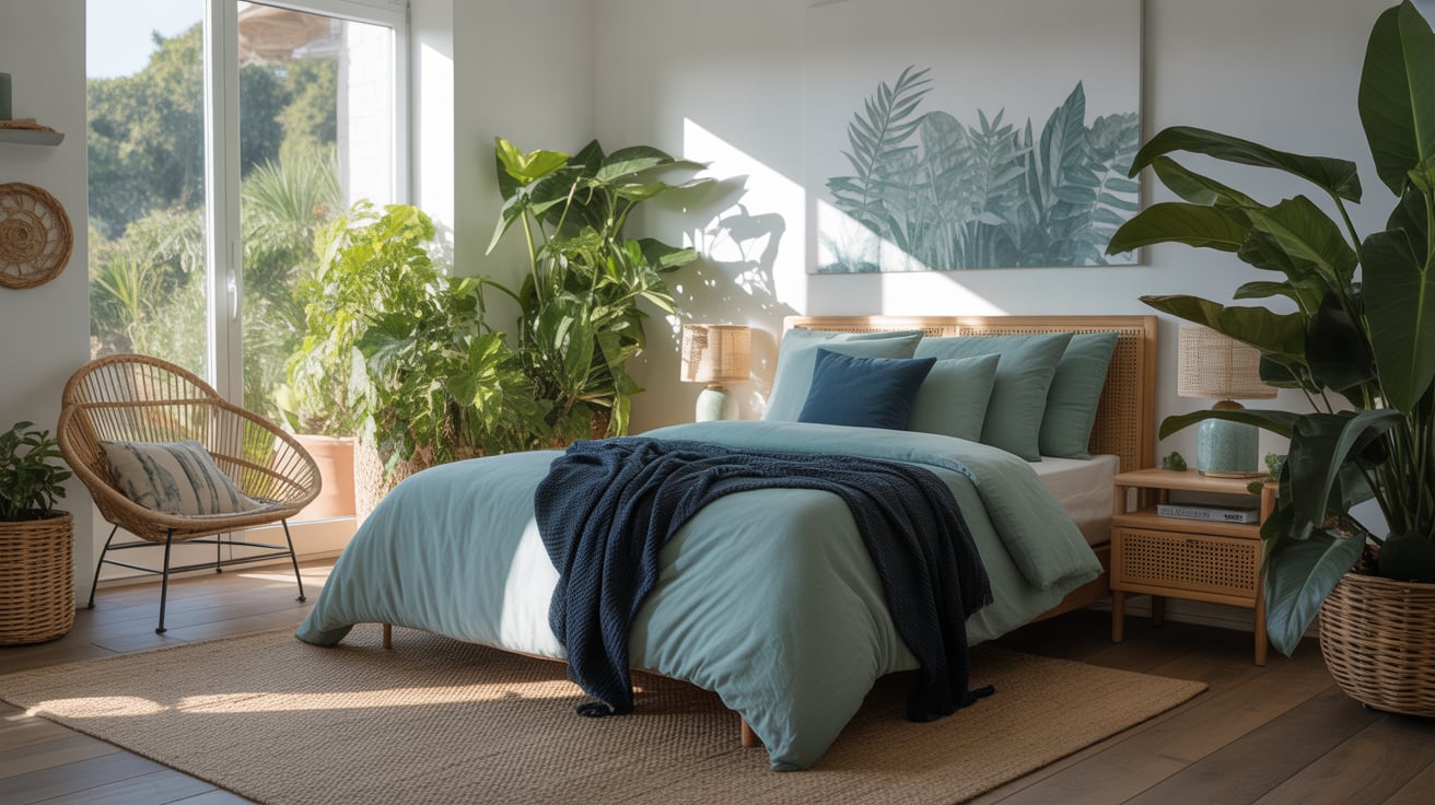 Add navy or teal cushions to your bed and place plants like fiddle leaf figs or hanging ivy nearby. The result is a lively yet calming space that feels instantly welcoming.