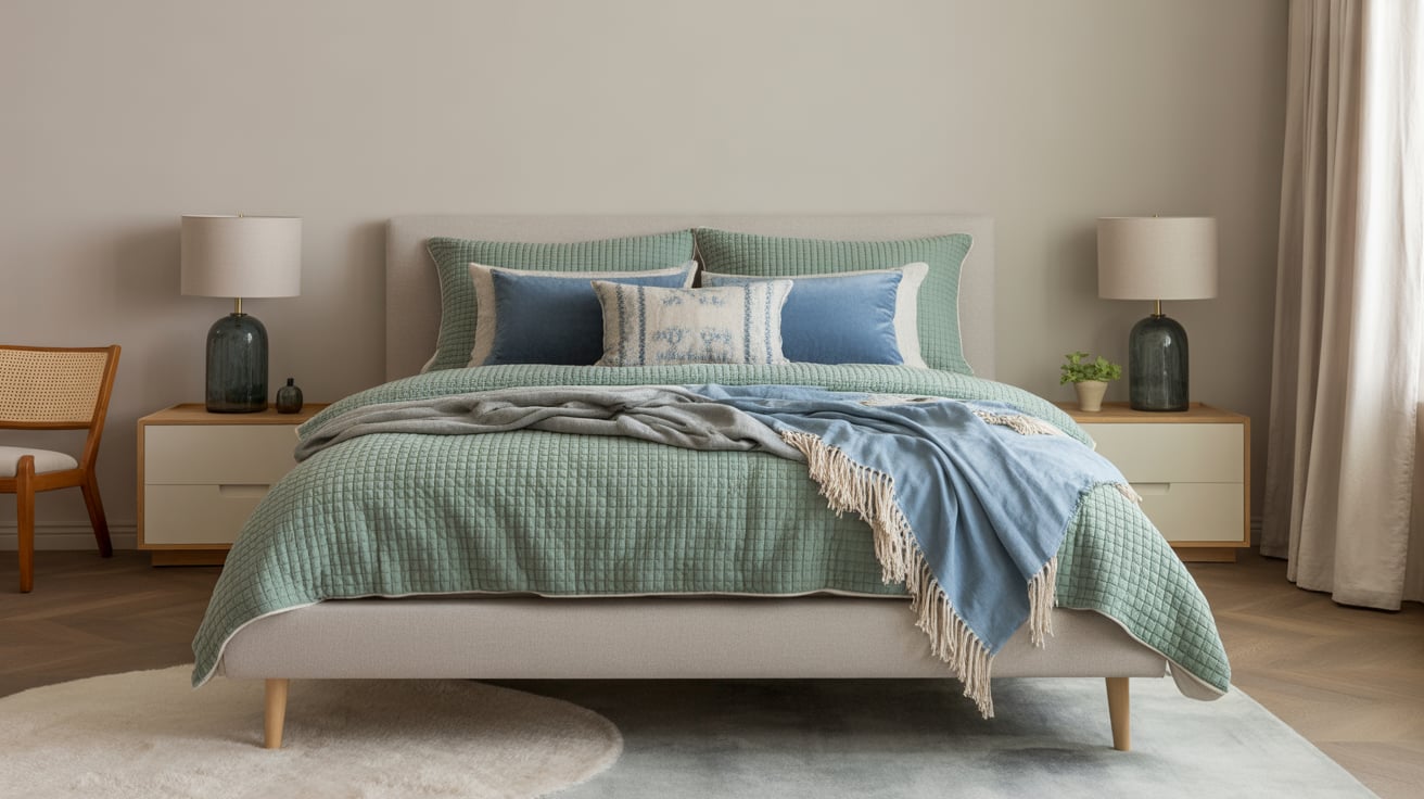 Textiles are the easiest way to try the green-and-blue trend without a full makeover. Think cozy blankets, patterned cushions, or two-tone beddings that combine both colors beautifully.