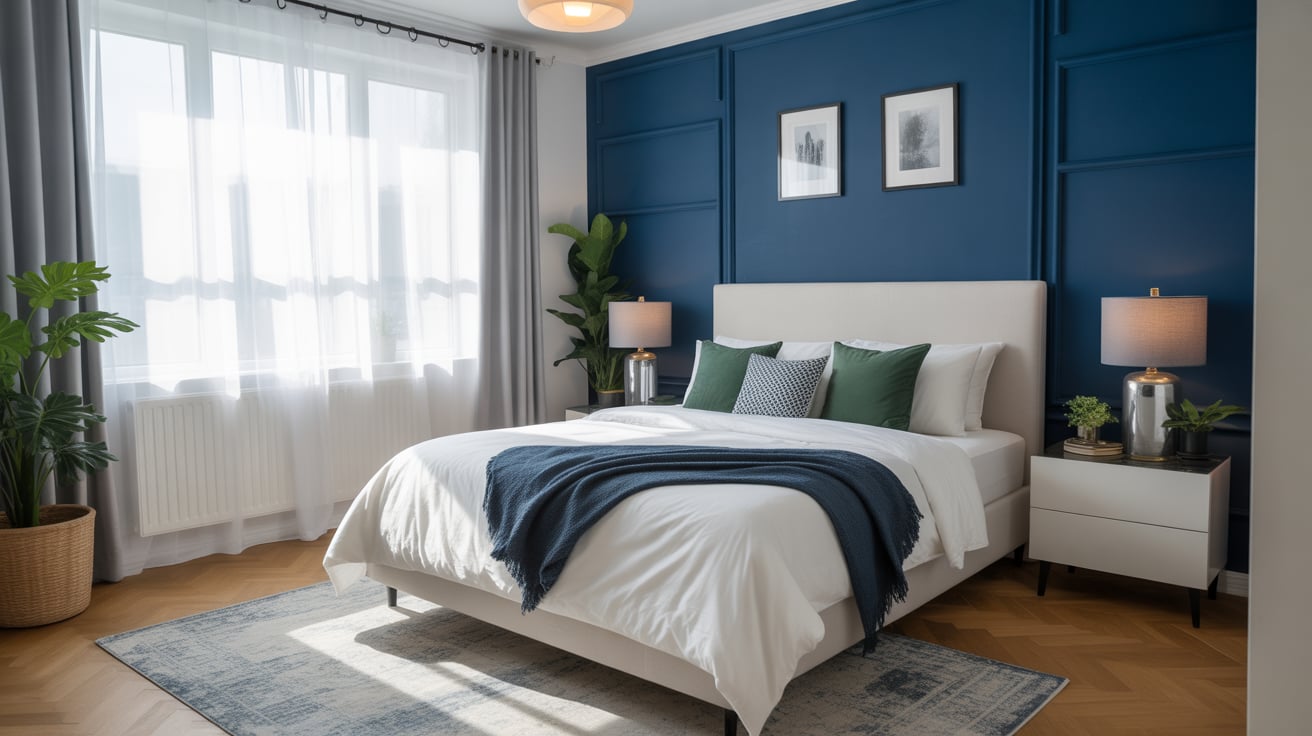 A feature wall in teal or navy instantly gives character to a bedroom. When paired with green decor, the space feels bold yet balanced, avoiding the flatness of a single-color design.