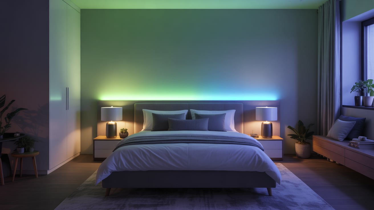 Lighting is often overlooked but can completely change the mood. Lampshades or LED lights in soft green or blue add subtle pops of color while keeping the bedroom cozy.