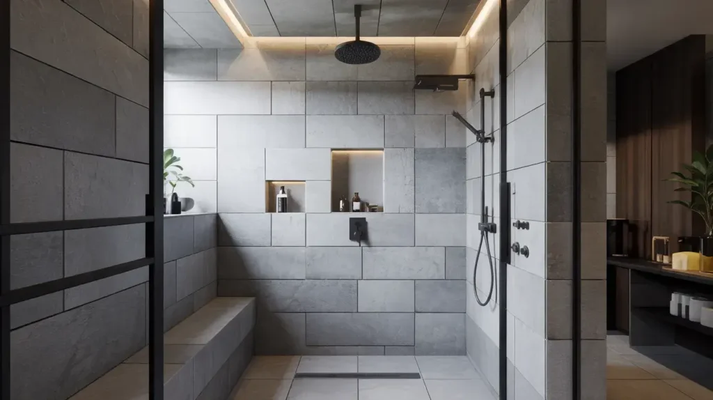 - Large-format tiles with minimal grout lines