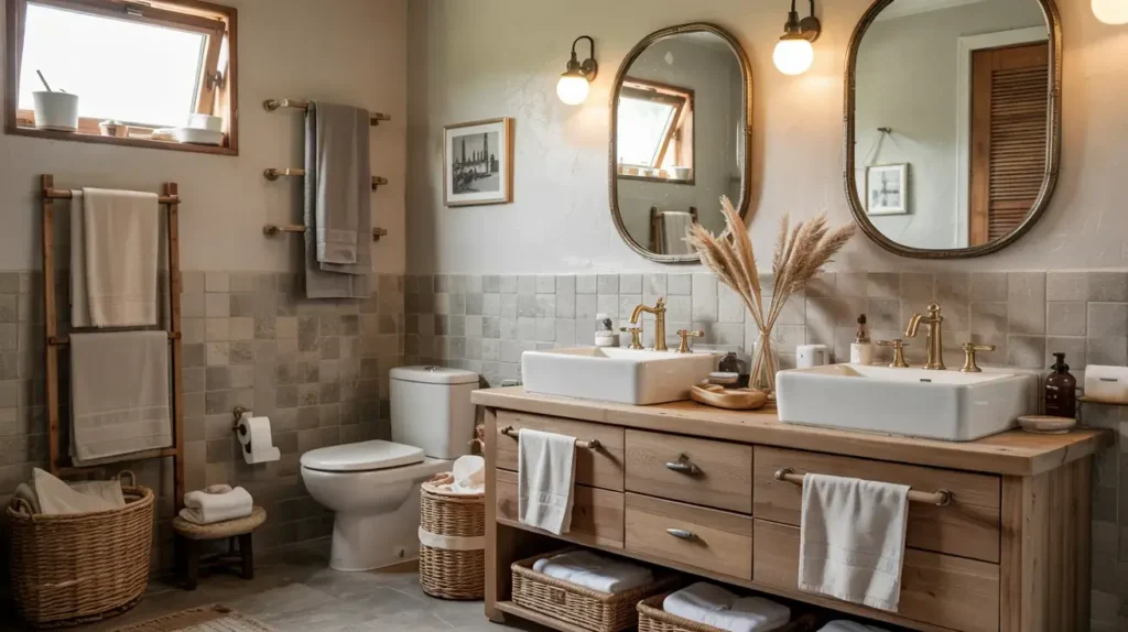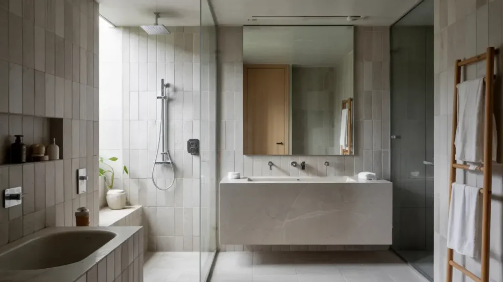 I’ve embraced minimalism in my bathroom, and honestly, it’s made my morning routine so much calmer. Everything has its place, nothing’s cluttered, but it doesn’t feel sterile because I chose warm-toned grey tiles and a beautiful wooden vanity.