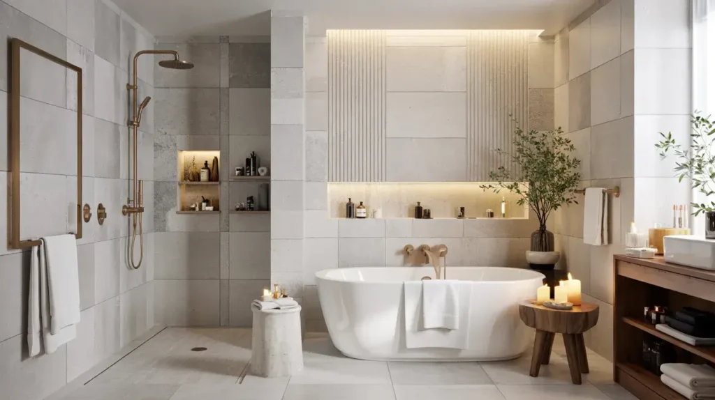 Look, grey tile bathrooms don’t have to be cold, sterile, or boring. The secret lies in layering warm elements thoughtfully—warm-toned greys, natural wood, brass or gold fixtures, plenty of warm lighting, and cozy textiles.