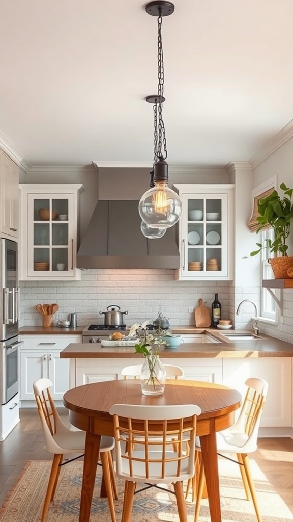 The blend of rustic and modern elements in the lighting fixture complements the overall design. The glass and metal design pairs well with the wooden table and white cabinetry, creating a harmonious look. It’s the kind of light that invites you to linger, making meals feel even more special.