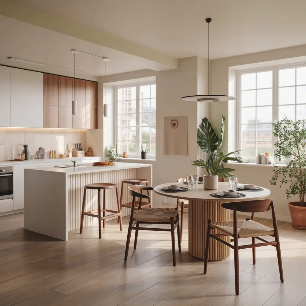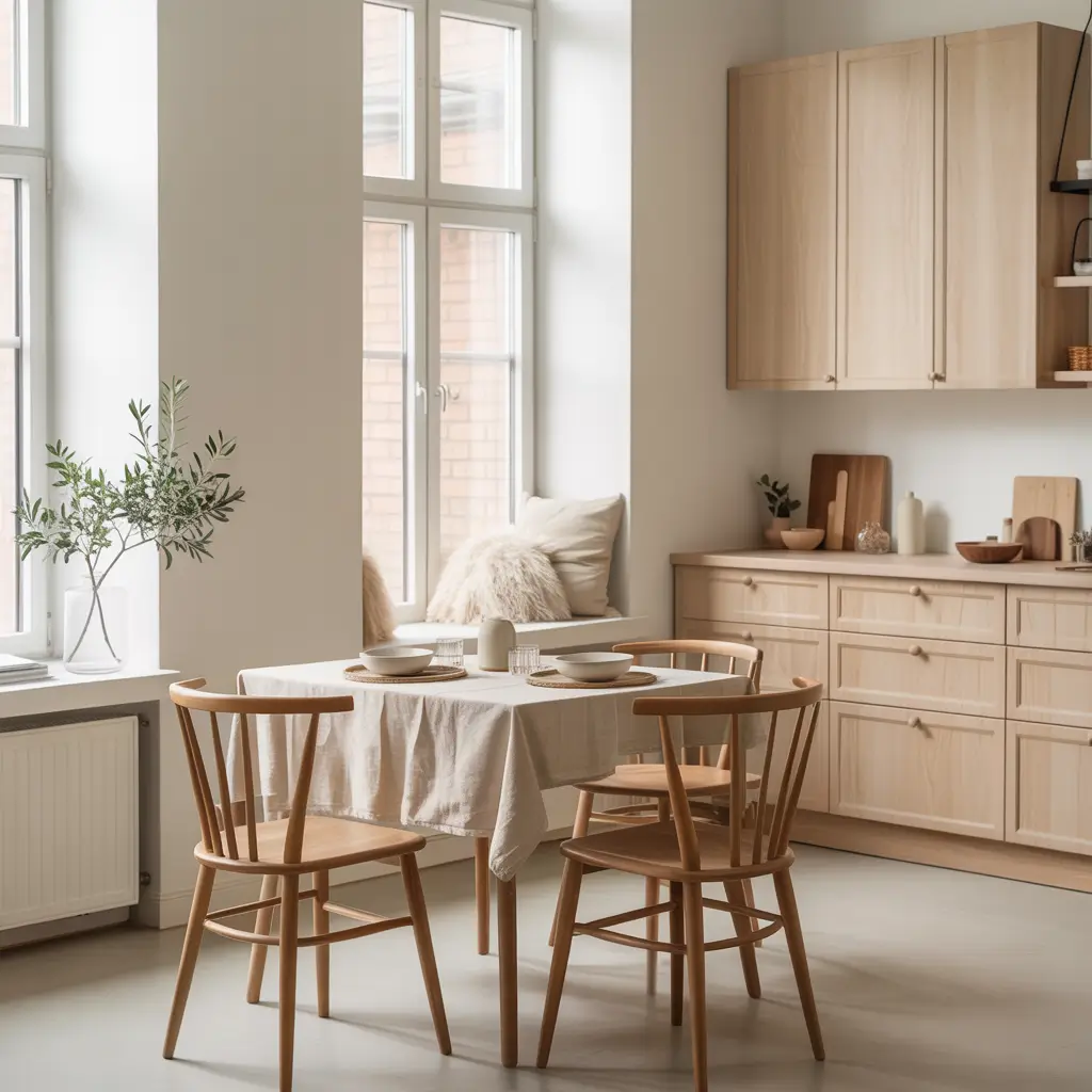 The dining area should feel hygge (that Danish concept of cozy contentment). I use simple wood chairs, maybe a sheepskin throw draped over one, and candles on the table. Scandinavian style proves you don’t need clutter to create warmth. The secret is in the textures and the quality of light.