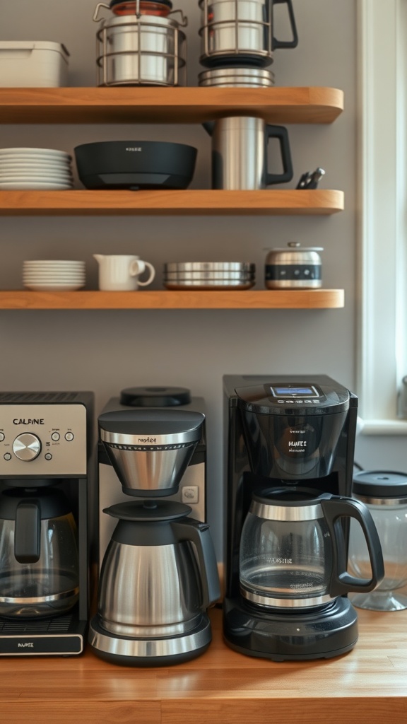 The first coffee maker on the left seems to be a drip machine, perfect for brewing multiple cups at once. It’s great for those busy mornings. Next to it is a sleek stainless steel option, which adds a modern touch and might even have a thermal carafe to keep your coffee hot longer.