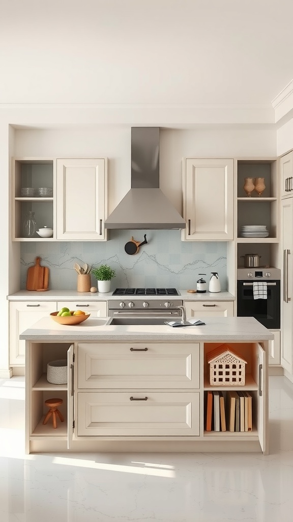 The island not only serves as a cooking station but also offers extra storage. With drawers and open shelving, you can keep essential items close at hand. This keeps your countertops clear and organized.