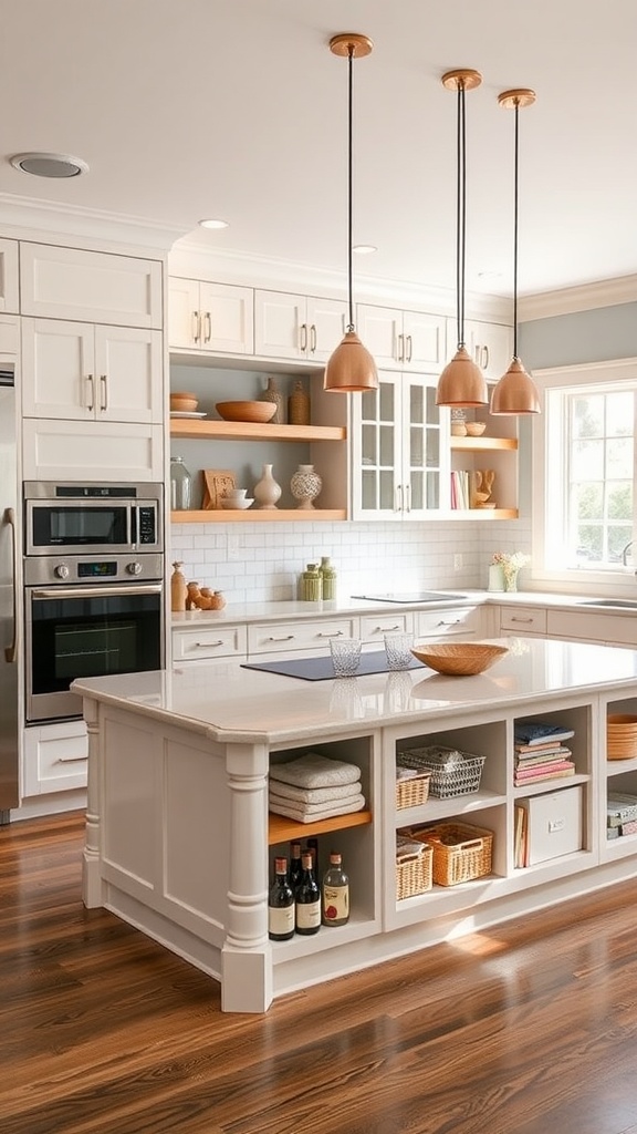 Kitchen islands are more than just a centerpiece; they can be a hub for storage solutions. The image showcases a well-designed kitchen island with integrated shelving and cabinets that maximize storage space. You can see various kitchenware neatly organized, making it easy to find what you need when cooking.
