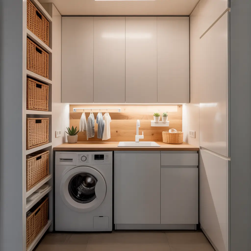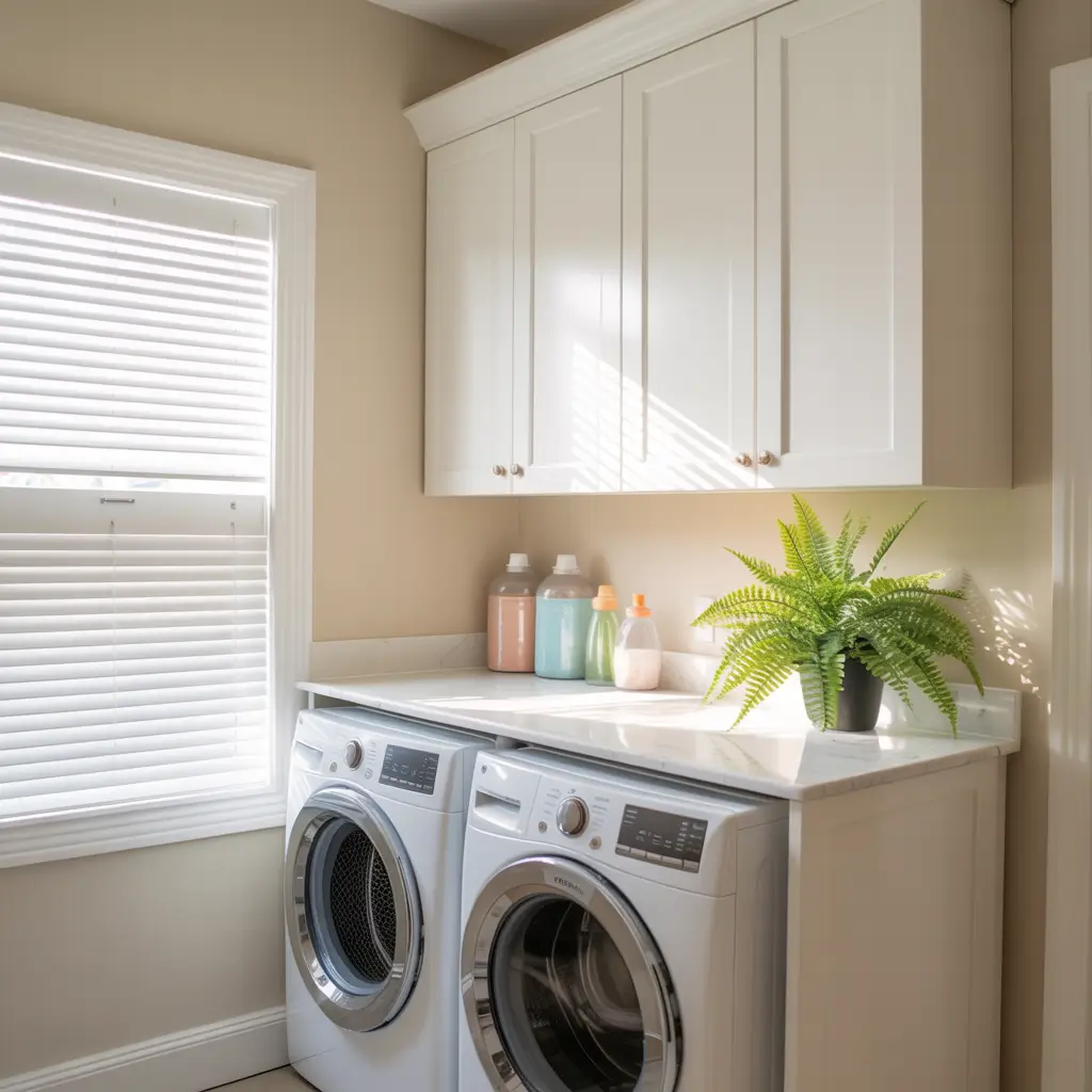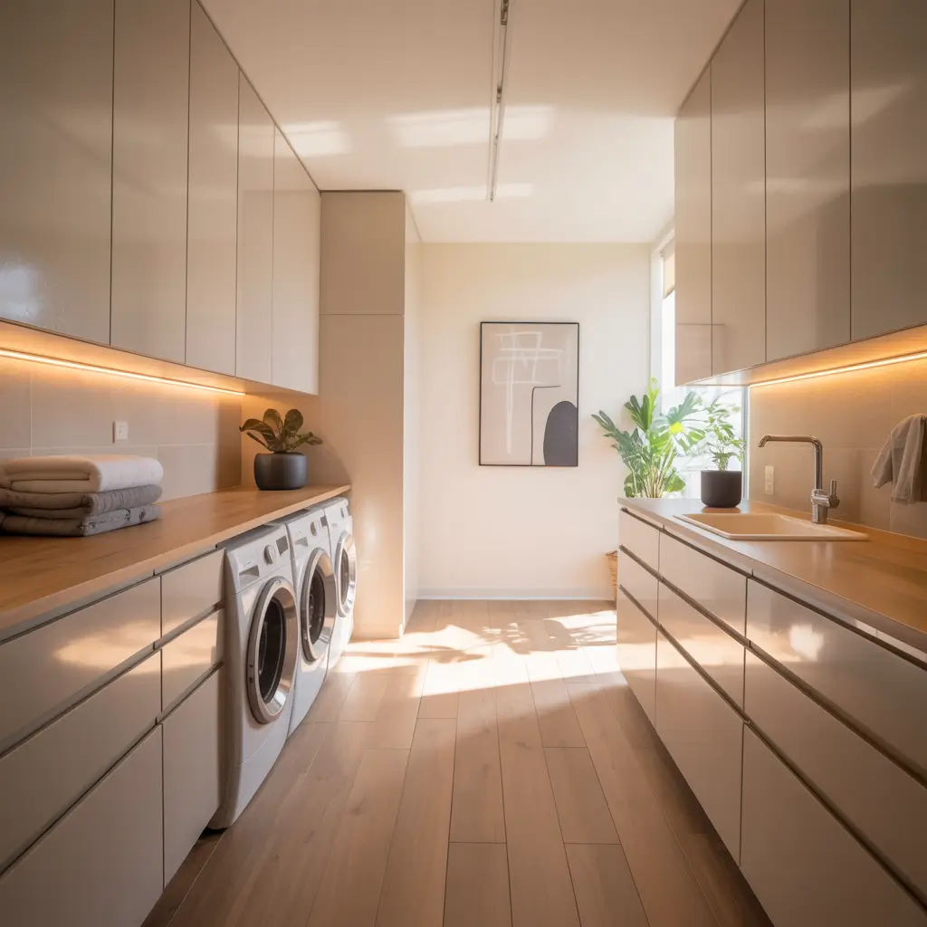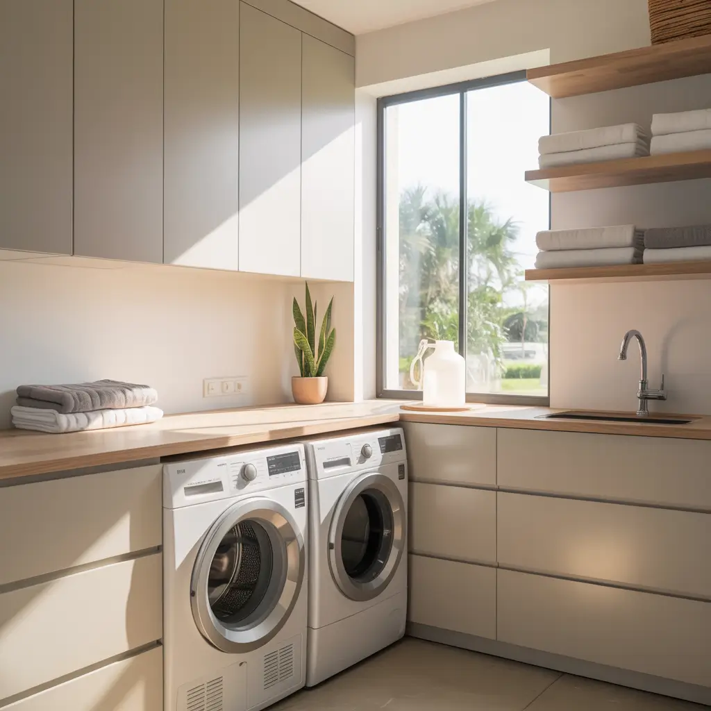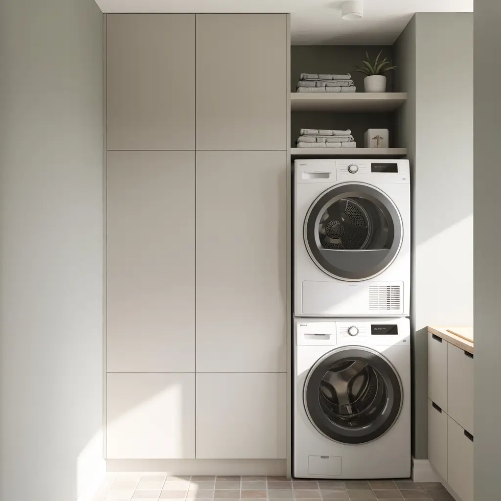 Built-in cabinets with an integrated folding counter are the ultimate functional setup. You pull clothes from the dryer, turn around, and boom—perfect folding surface with all your storage right there. No more piling clean clothes on top of the dryer or using your bed as a folding station.