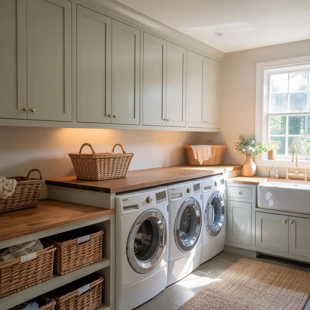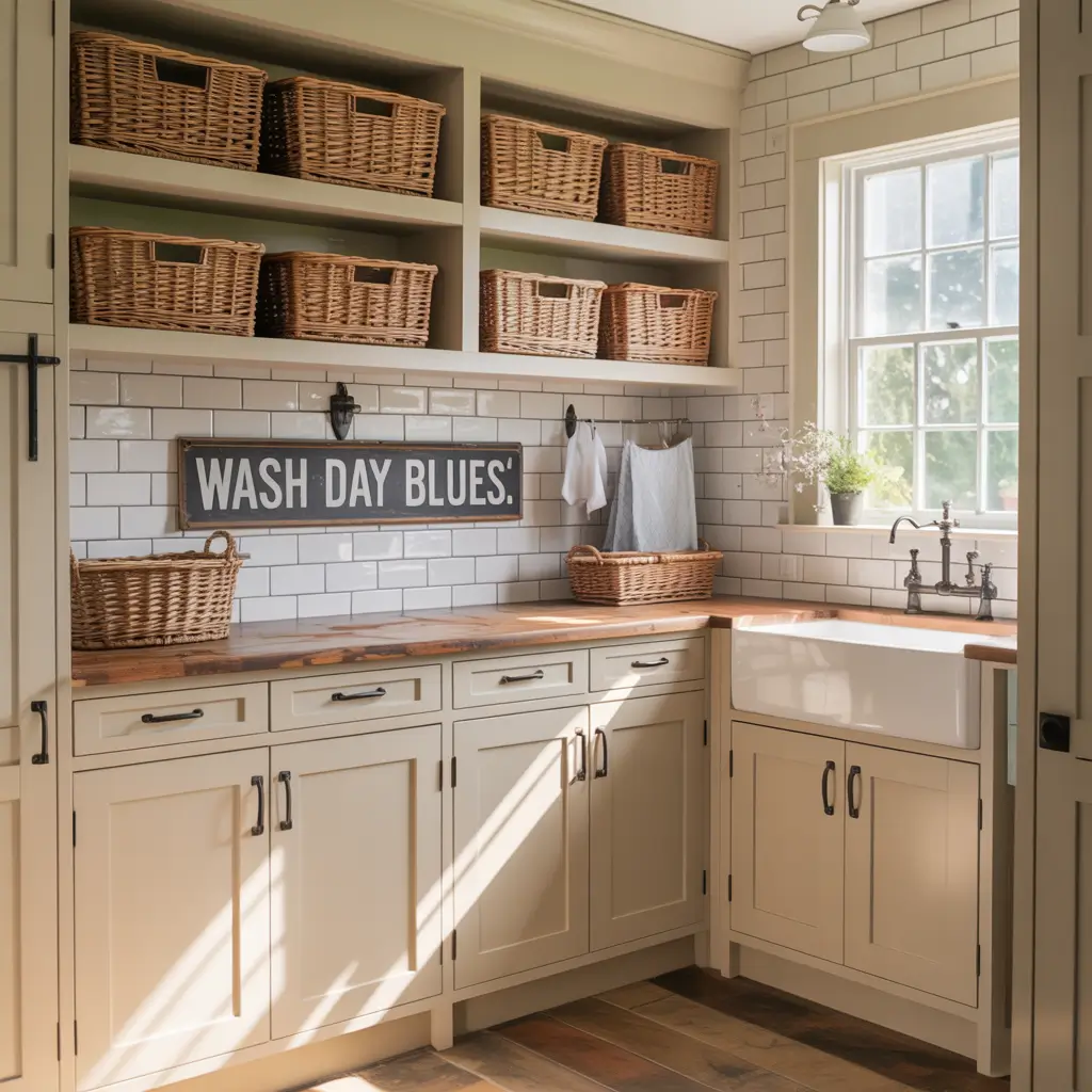I added a butcher block countertop to my farmhouse setup, and it’s held up beautifully (just seal it properly!). The warmth of the wood makes doing laundry feel less like a chore and more like… okay, it’s still a chore, but at least I’m doing it in a pretty room :/