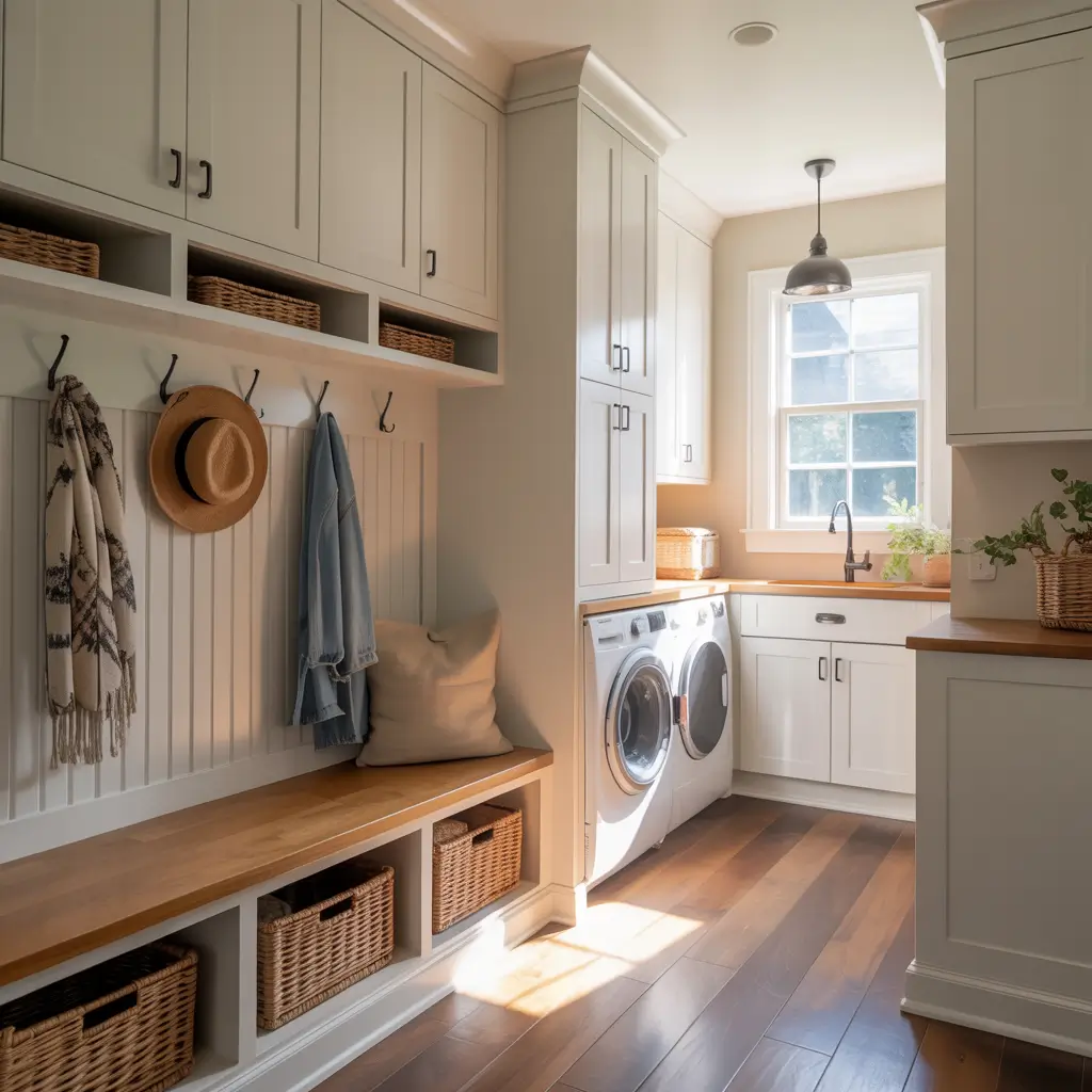 My combo space has cabinets that serve double duty. Upper cabinets store laundry supplies, lower cabinets have cubbies for shoes and bags. There’s a bench with storage underneath, hooks for coats, and my washer and dryer are tucked into a closet with bifold doors.