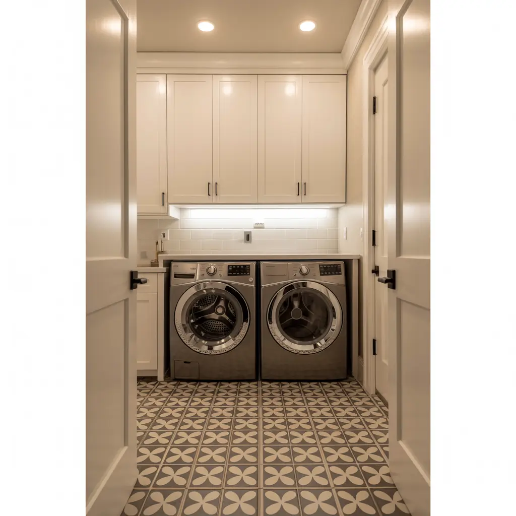 My neighbor installed black and white floral patterned tiles, and her laundry room now looks like it belongs in a design magazine. She paired them with white shiplap walls and brass fixtures—chef’s kiss. The contrast is stunning, and the pattern actually helps hide the occasional lint or dust bunny that escapes the dryer.