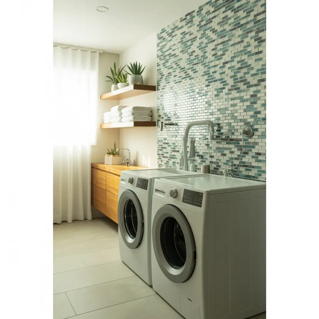 Sometimes you just need a little sparkle, right? Mosaic accent tiles bring color, texture, and visual interest to laundry room walls. These small tiles—usually mounted on mesh sheets—create gorgeous accent areas that elevate the entire space.
