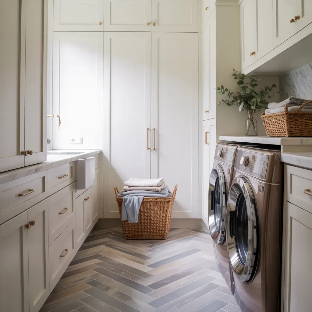Want your laundry room to look expensive? Install tiles in a herringbone pattern. This classic arrangement instantly upgrades any space, making it look custom and high-end. I’ve seen herringbone in marble, subway tile, wood-look planks, and plain porcelain—it works beautifully with everything.