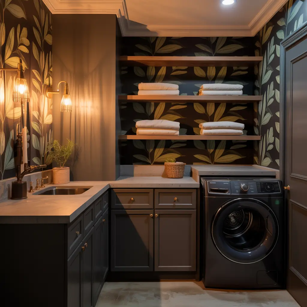 I won’t lie—I was skeptical about gold in a laundry room at first. Seems a bit extra, right? But then I saw a laundry room with navy wallpaper featuring delicate gold palm fronds, and I completely changed my tune. The gold catches the light and creates this luxurious atmosphere that makes folding towels feel almost meditative.