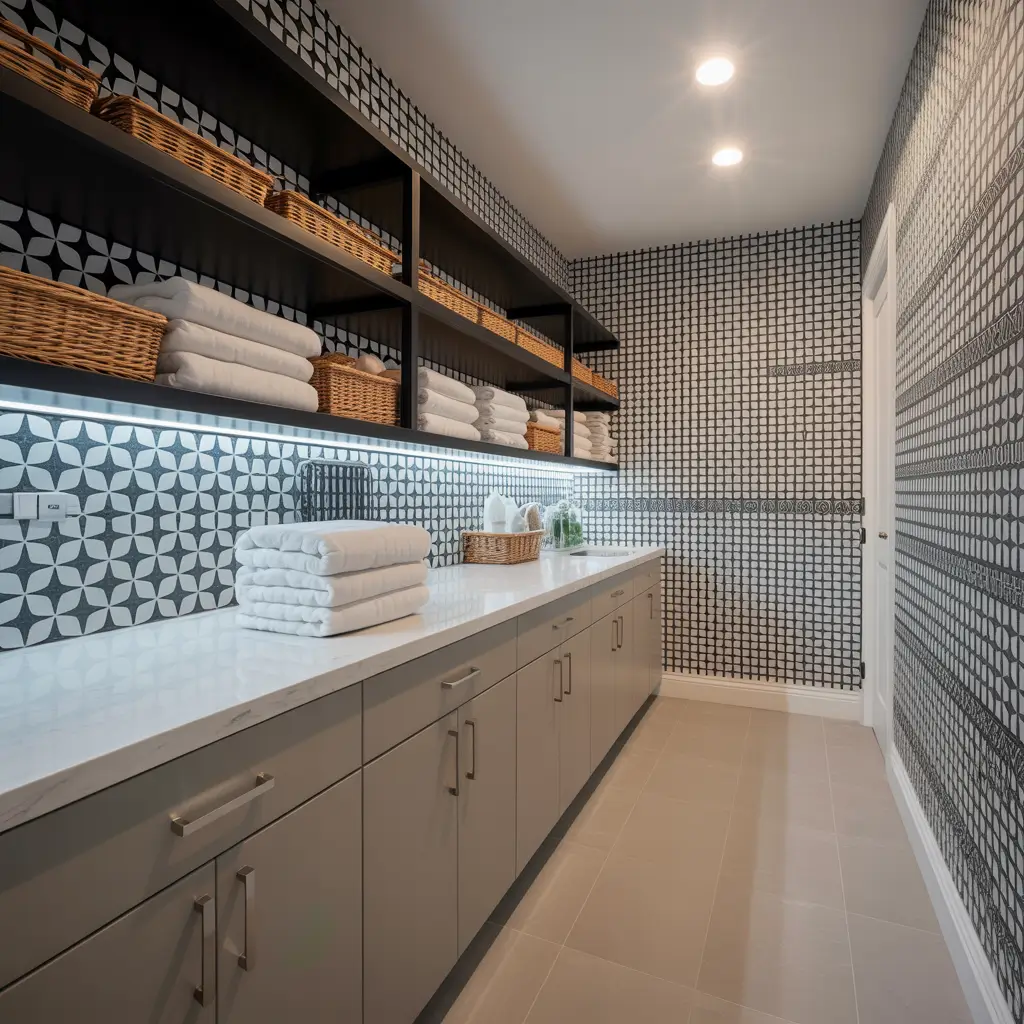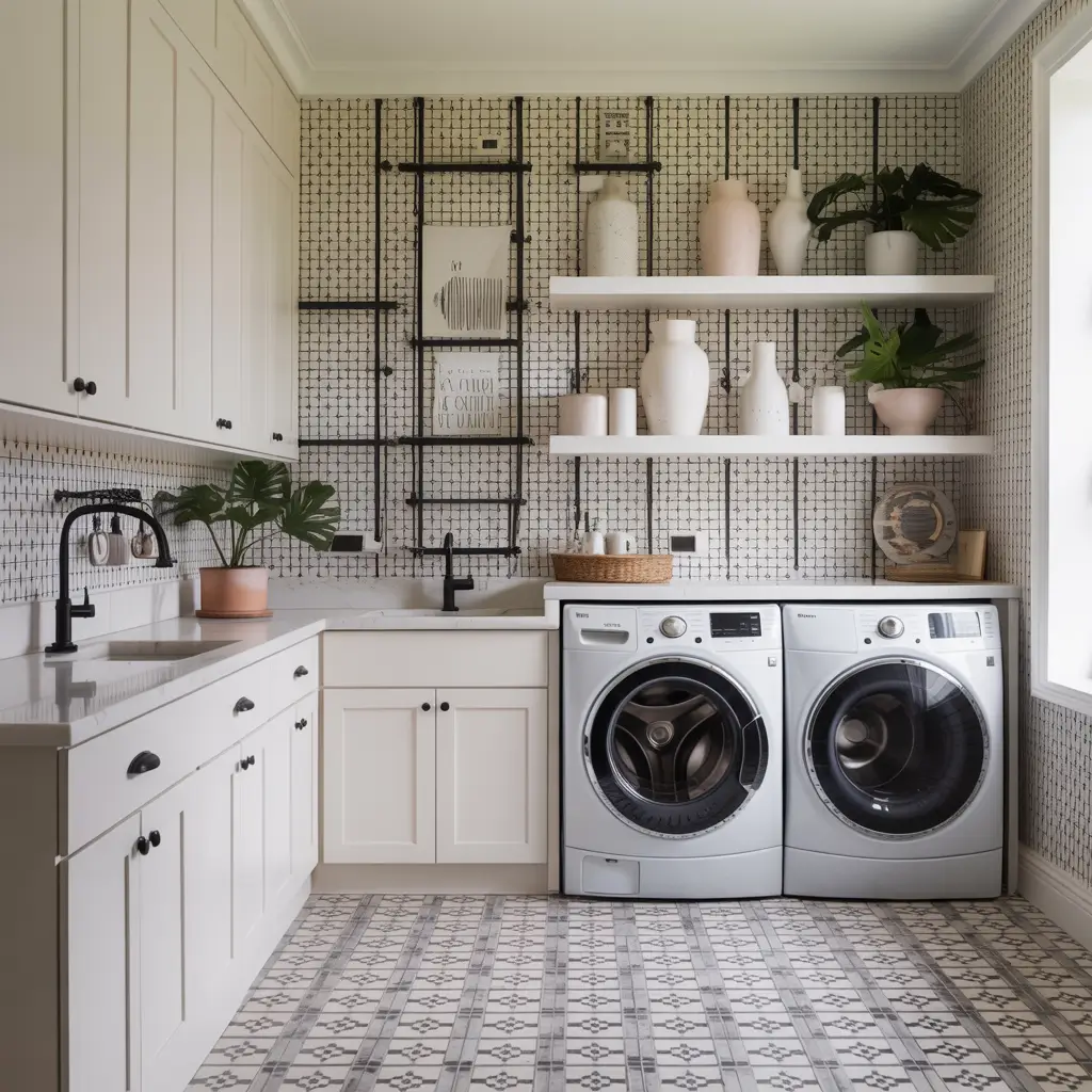 Geometric patterns bring this crisp, contemporary energy that makes your laundry room feel intentionally designed. I’m obsessed with how clean lines and repeated shapes create visual interest without being too busy or overwhelming.