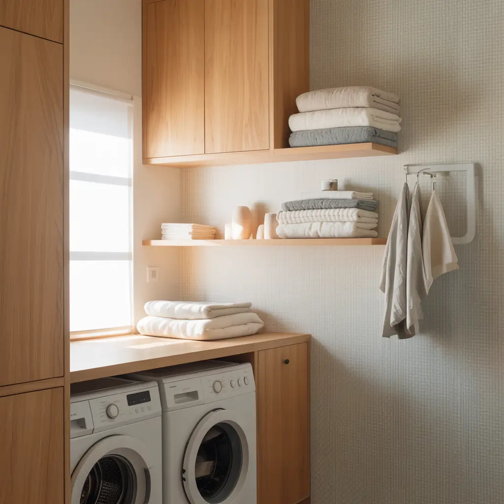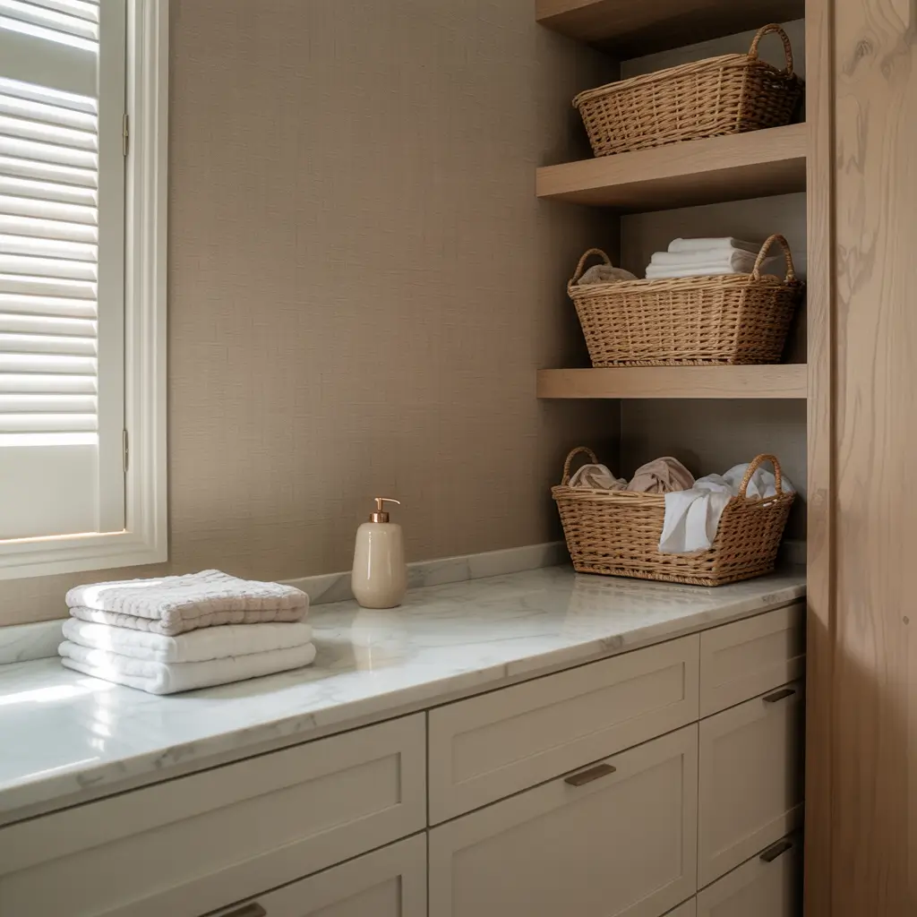 I’m drawn to this aesthetic because it makes even the smallest laundry closet feel calm and organized. There’s something about those clean lines and muted colors that makes me actually want to keep the space tidy (which is saying something).