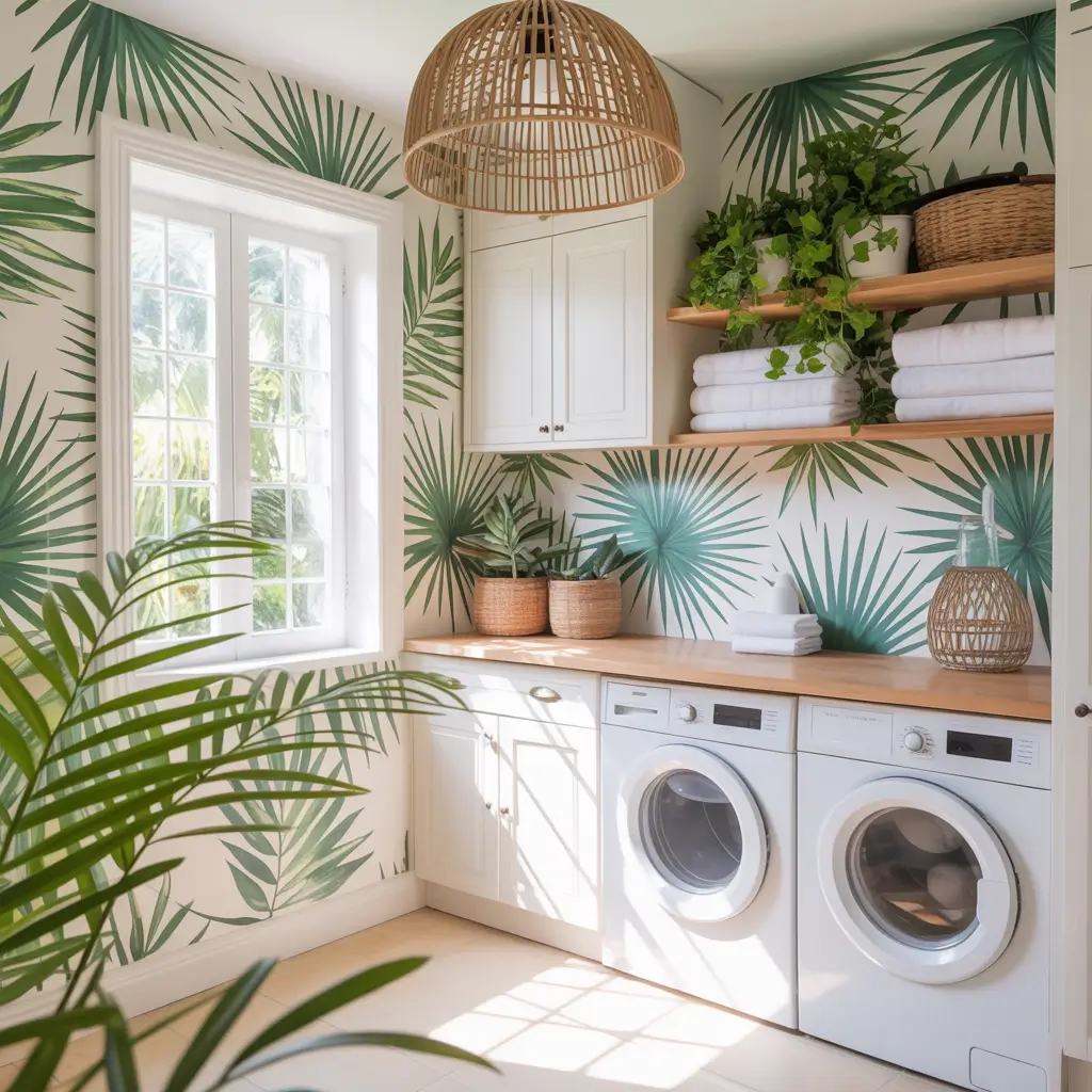 Want to feel like you’re on vacation while doing the world’s most boring chore? Tropical palm print wallpaper brings that resort vibe straight to your laundry room. I’m talking banana leaves, palm fronds, monstera plants—basically anything that screams “I’d rather be at the beach.”