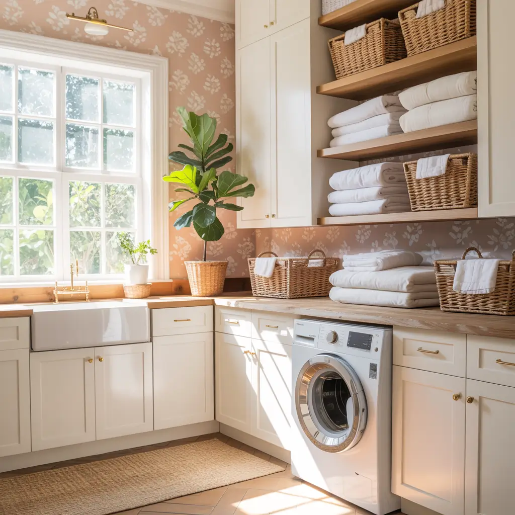 I’ll be honest—farmhouse style has been done to death, but there’s a reason it sticks around. When you nail the vintage farmhouse wallpaper look, your laundry room feels cozy, nostalgic, and genuinely welcoming.