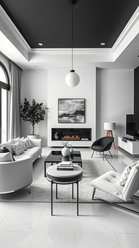 A monochrome color scheme can bring a serene and sophisticated feel to any living room. In this image, the use of black and white creates a striking contrast that captures attention. The sleek furniture pieces are arranged thoughtfully, emphasizing clean lines and modern design.