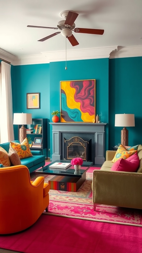 This living room is bursting with vibrant colors that create a lively and inviting atmosphere. The backdrop features a striking teal wall that instantly draws attention. It sets the stage for the colorful furniture and decor that follow.