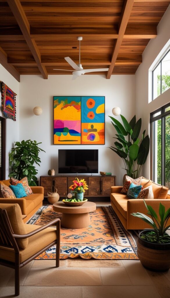 Combining traditional and modern styles in Mexican home decor creates a unique and inviting space. The image showcases a cozy living room that perfectly blends these elements. The warm wooden ceiling contrasts beautifully with the sleek furniture and contemporary design.