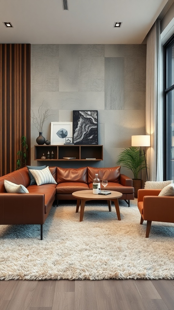 This living room showcases a delightful mix of textures, creating a cozy and inviting space. The rich, brown leather sofa adds warmth and a touch of luxury, contrasting beautifully with the soft, fluffy area rug. The rug’s plush fibers invite you to sink your feet in, enhancing comfort.