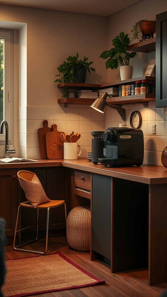 Creating a cozy home coffee nook is a delightful way to enjoy your daily cup. This image showcases a charming corner in a kitchen that exudes warmth and style. The dark wood cabinetry blends perfectly with the natural elements like the potted plants on the shelves. They bring a touch of life to the space, making it feel inviting.