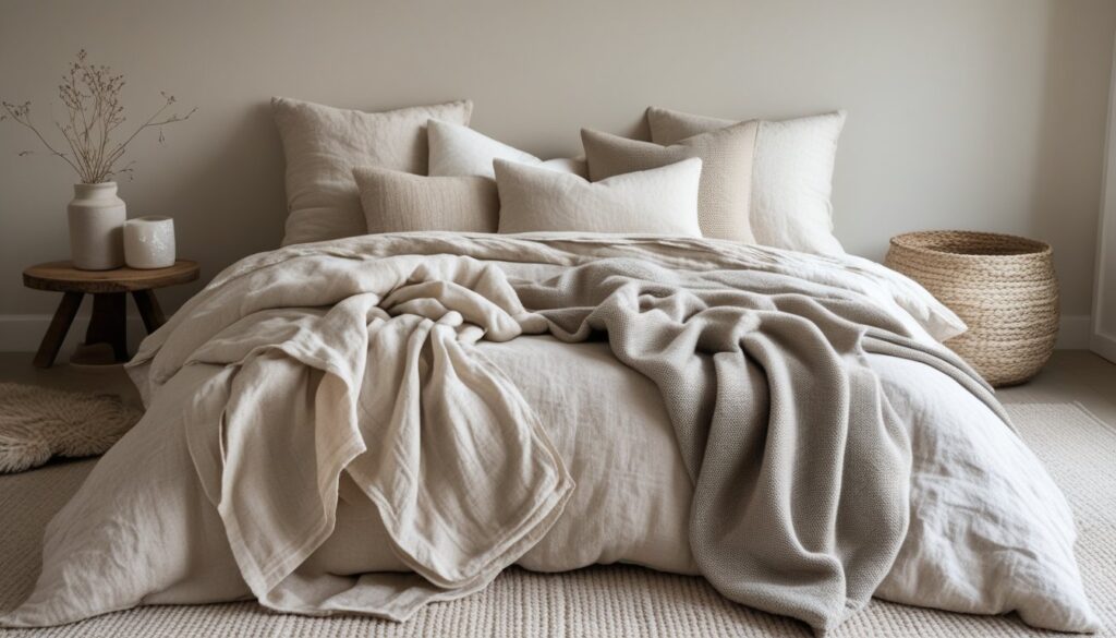 Why It Works: Layered bedding enhances coziness and visual interest without breaking the neutral theme.