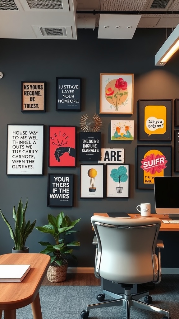 Wall art can transform an office space into a source of inspiration. The image captures a vibrant arrangement of framed art that speaks to creativity and motivation. Each piece adds a unique touch, combining playful quotes and elegant designs.
