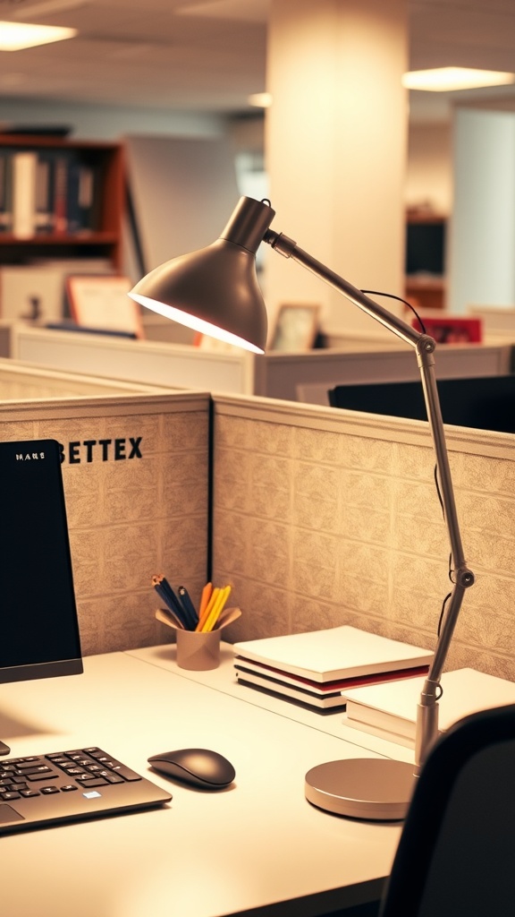 Having the right lighting at your desk is key to creating a workspace that feels inviting and practical. The image showcases a sleek desk lamp that combines function with style. This lamp is not only a source of light but also adds a modern touch to the cubicle.