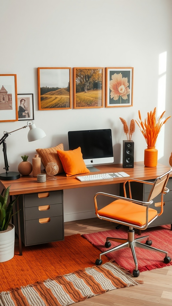 The bright orange chair and decorative elements are eye-catching. They contrast nicely with the more neutral tones of the desk and other furniture. Such warm accents can make your workspace feel inviting and energizing.