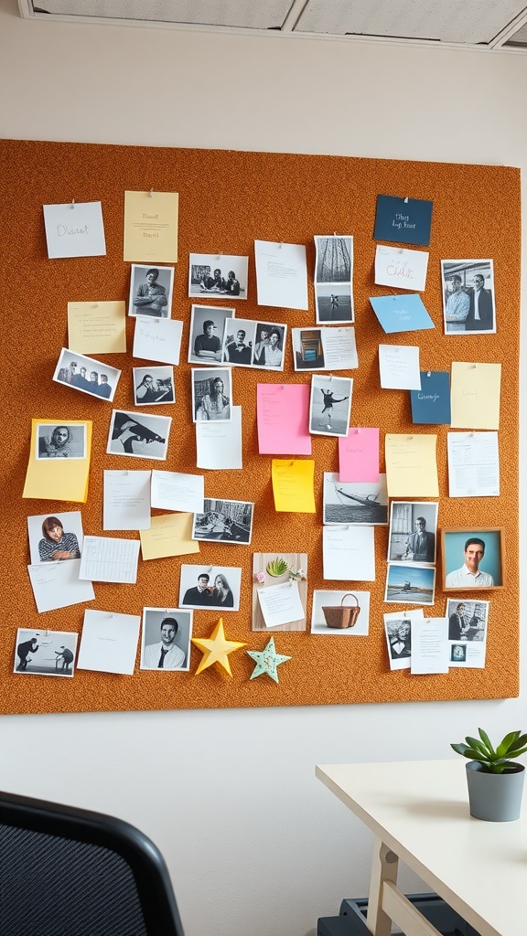 Bulletin boards can be a fun way to express creativity in the office. This image showcases a vibrant cork board filled with notes, photos, and colorful sticky notes.