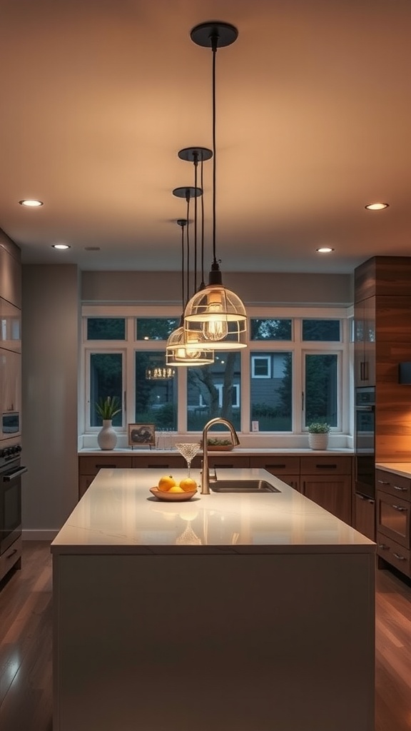 Choosing different styles and shapes for your pendants, like the industrial feel of the cage light versus the sleek dome shape, adds visual interest. This layering allows you to highlight the kitchen island while ensuring that every corner is well-lit.