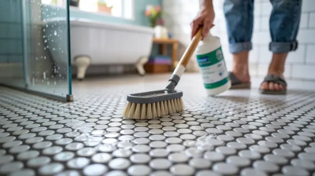 For the deep clean, mix equal parts water and white vinegar in a spray bottle, spray the floor, and let it sit for about 10 minutes. Then scrub with a medium-bristle brush (not too hard or you’ll damage the grout). Rinse thoroughly and dry with a microfiber cloth.
