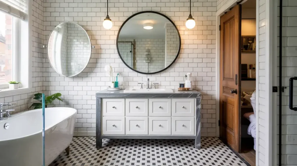 Alternate black and white penny tiles in a checkerboard pattern for vintage charm with modern appeal. This look works especially well in art deco or retro-inspired bathrooms. I’ve seen this paired with brass fixtures and pink walls, and it was legitimately stunning.