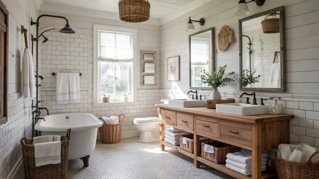 The contrast between penny tile floors and reclaimed wood elements (floating shelves, mirror frames, window trim) creates textural interest that’s peak farmhouse chic. I’ve seen this combo in real life, and it’s absolutely swoon-worthy.