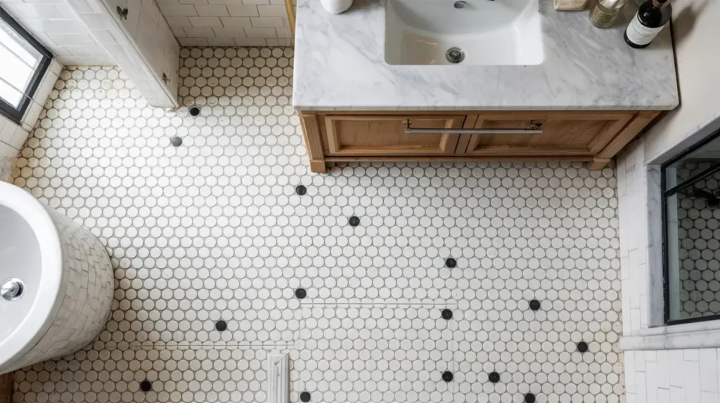 But here’s another approach: use penny tile in the shower and a complementary larger tile on the rest of the bathroom floor. This creates visual zones and can actually make installation easier and more affordable since you’re not penny-tiling your entire bathroom.
