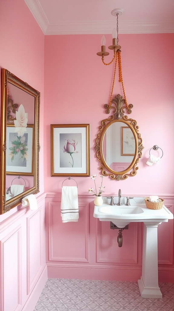 A pink bathroom can be a cheerful space, especially with art that pops. Framed prints add a personal touch and complement the soft pink walls beautifully. Don’t forget to balance the decor with some elegant mirrors to reflect light and create a cozy vibe.